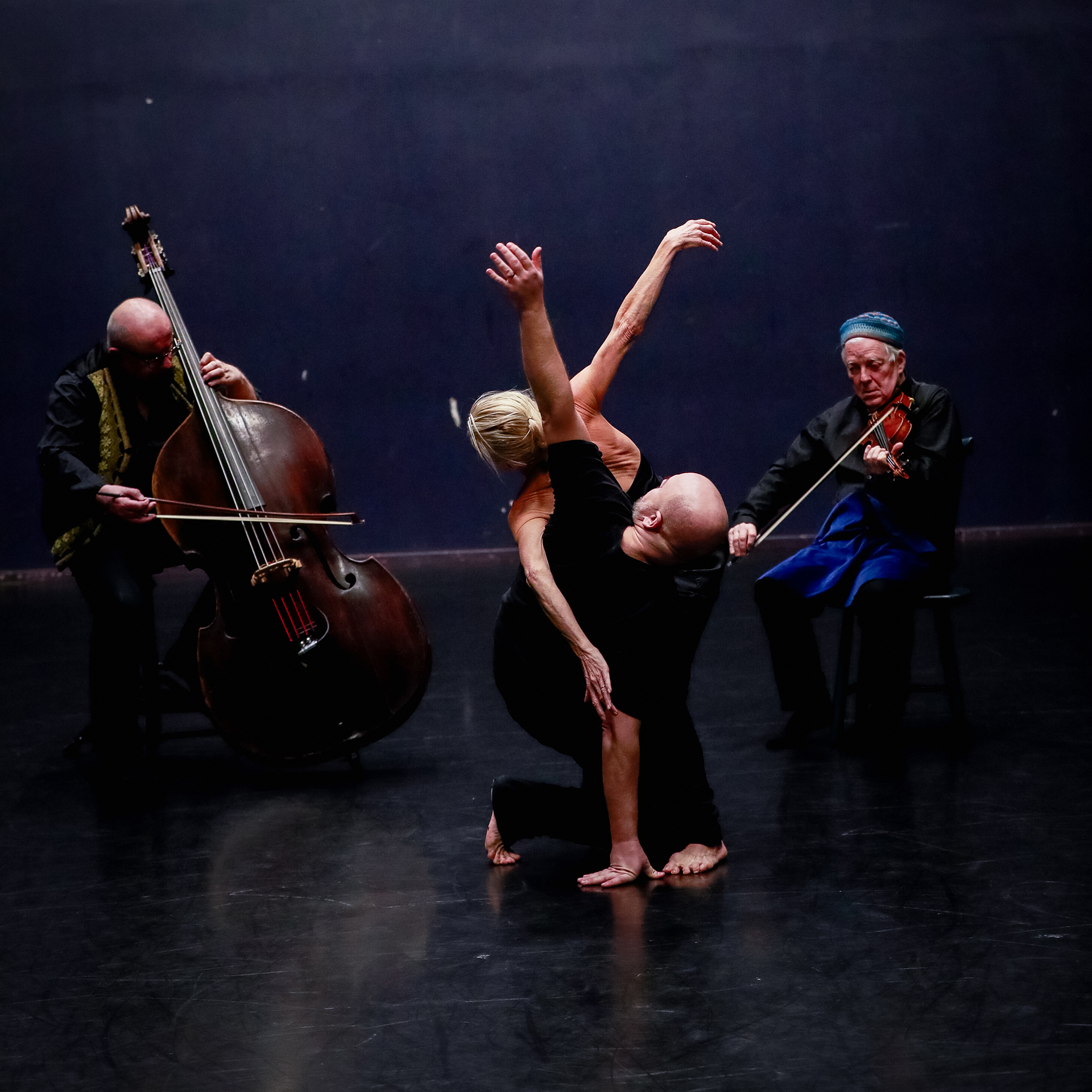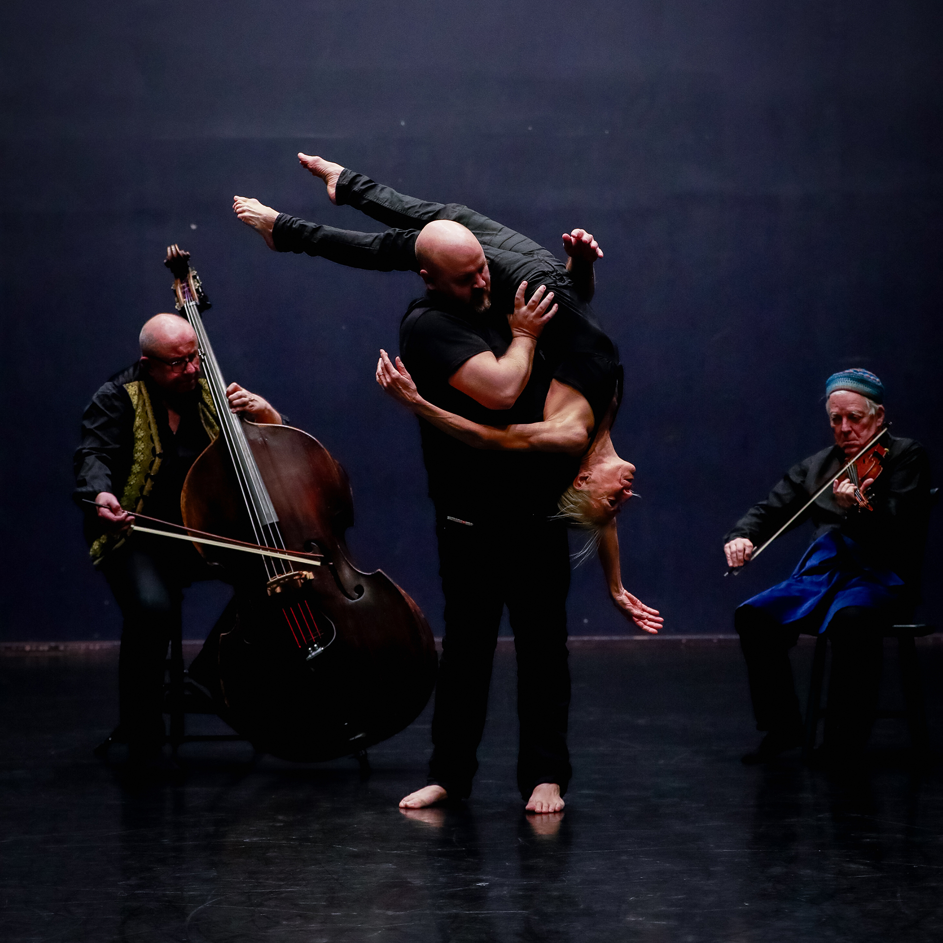 The work is rooted in a physical interpretation of Bonniér’s theories on the correspondence between sound waves and bodily movement. At its core is the living interaction between the musicians — double bass and violin — and the dancers, where music takes on a visible and tangible form through acrobatics, rhythm, and movement.